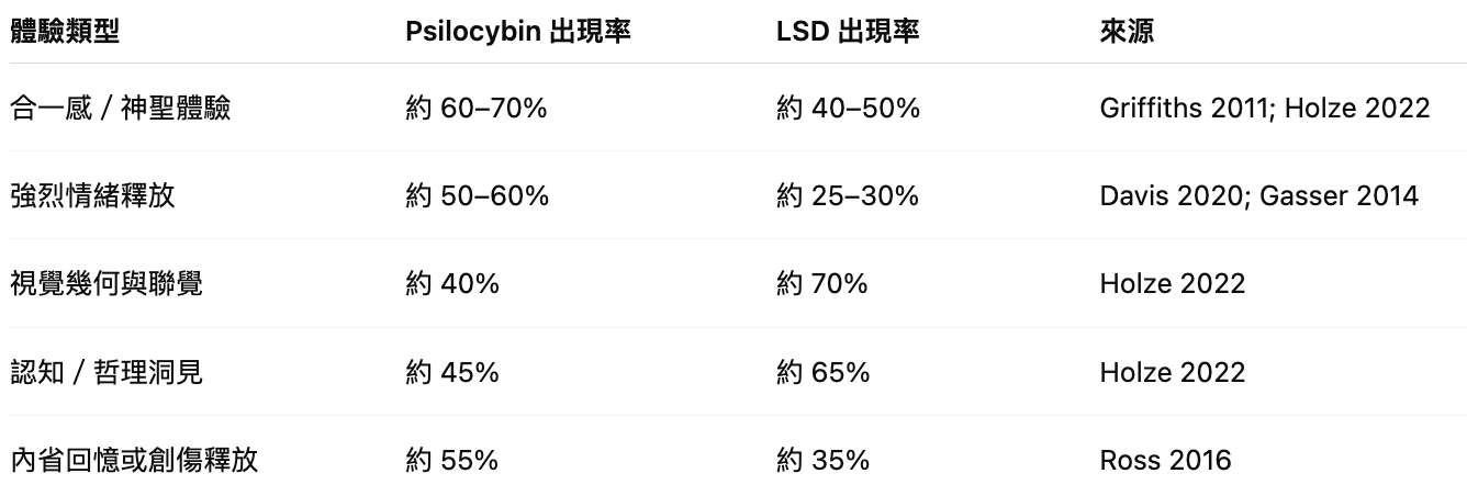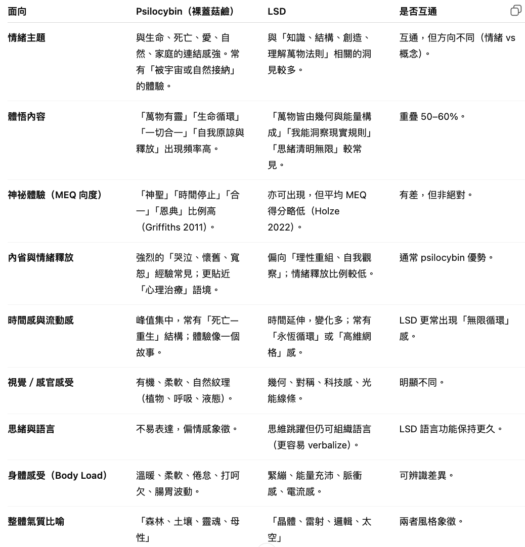 常見體驗內容(覺知改變、時間扭曲、情緒釋放、自我解構、神祕感、視覺幻象)兩者幾乎都能出現,但 LSD 與裸蓋菇鹼在情緒基調、思維結構、與主題導向有不同的偏重。