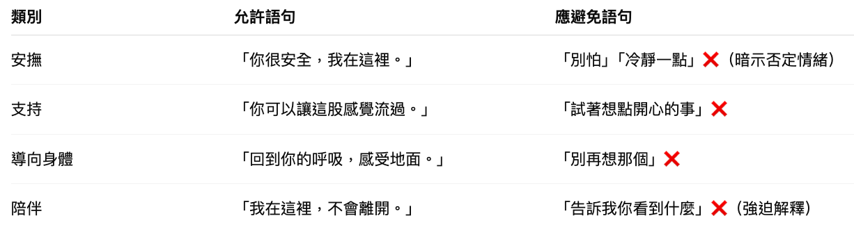 - 讓受試者感受身體與床或地面接觸,手放在大腿上感受重量,或提供受試者象徵物幫助安心與感受到愛