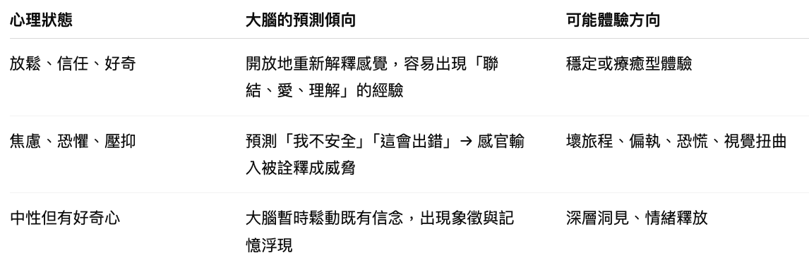 若個體願意放下控制、開放接受,這種狀態更容易導致情緒重組與洞見 (Carhart-Harris, 2018)