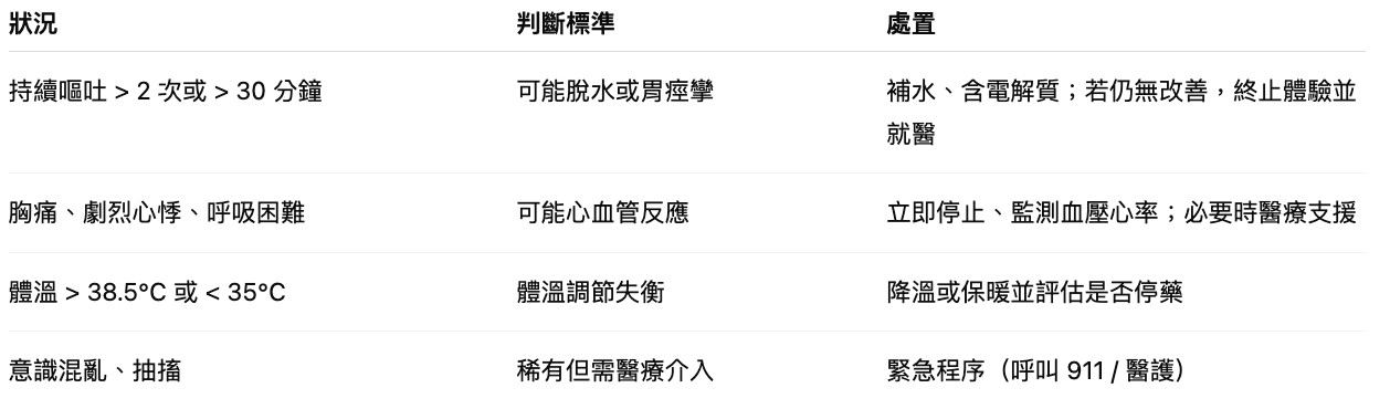 若真的焦慮持續升高,則將音樂暫停、取下眼罩、房間微光、提供保暖毯、讓受試者側躺、緩慢呼吸、不再提問、不引導、只守護,告訴受試者藥效再不斷消退,你很安全,我在這裡。